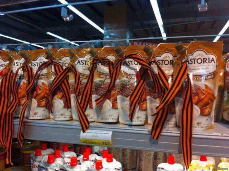 В преддверие 9 Мая прилавки российских магазинов «захватили» продукты с георгиевскими лентами, пишет www.obozrevatel.com.