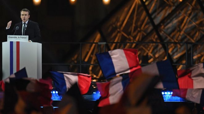 В ходе своего первого публичного выступления перед сторонниками избранный президент отметил, что его победа беспрецедентна. «То, что мы сделали за месяцы работы, беспрецедентно и не имеет аналога. Все говорили, что это невозможно, но они просто не знают ничего о Франции», — заявил он под ликование собравшихся у здания Лувра в Париже вечером, 7 мая.