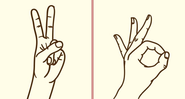 Сложите пальцы правой руки так, чтобы они показывали знак «мир», пальцами левой руки покажите «ок». Затем поочередно смените положение пальцев так, чтобы уже левая рука показывала «мир», правая — «ок». Повторите несоколько раз. А теперь выполните это упражнение одновременно правой и левой рукой.