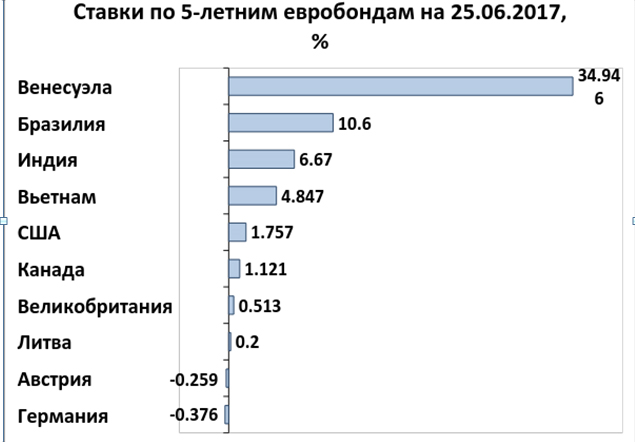 Ставки по евробондам, как и по любым другим инвестиционным инструментам, напрямую связаны с рисками, которые берет на себя инвестор. По состоянию на конец июня среди пятилетних бумаг самую высокую доходность предполагали бонды Венесуэлы – почти 35% годовых. Это баснословная доходность для такого консервативного инструмента, как государственные облигации, но и Венесуэла ведь – страна особенная. 10,6% – то есть больше, чем в Беларуси – предлагалось по бразильским облигациям: политический кризис в стране и неопределенность на рынке нефти совсем не способствуют высокому доверию со стороны инвесторов. Такие страны, как Индия и Вьетнам могут фондироваться дешевле, чем Беларусь – по 6,7% и 4,9% соответственно. Европейским государствам достаточно предложить инвесторам лишь несколько десятых процента.