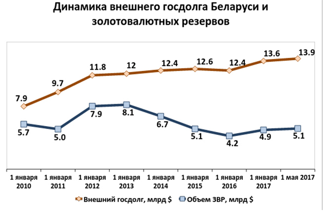 Вот и приходится брать в долг у всех, кто дает. Только в этом году Минфин уже взял в долг через облигации на внутреннем рынке больше 400 млн долларов, на внешнем – 1,4 млрд долларов, а еще 300 млн долларов предоставил ЕФСР. Впереди – новые транши кредита ЕФСР (общий план по итогам года – 700 млн долларов), а также 700 млн долларов персонально от России по итогам апрельской встречи Лукашенко и Путина. Скорее всего, объем внешнего госдолга к концу года приблизится к отметке 16 млрд долларов. Тенденция к росту внешнего госдолга наблюдается уже много лет, а вот динамика ЗВР неоднозначная.