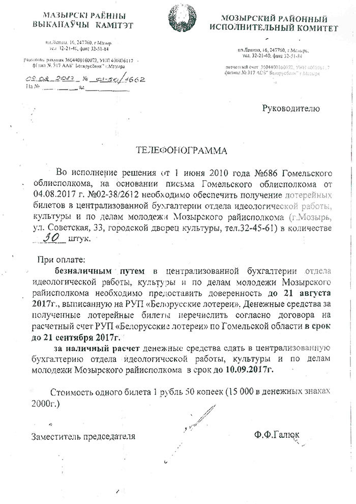 Заместитель председателя Мозырского райисполкома Ф.Ф.Галюк требует от руководителей предприятий всех форм собственности купить по 30 лотерейных билетов.