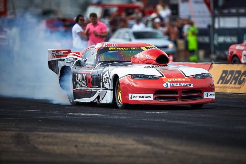 В Минск из Москвы привезли две быстрейшие машины в СНГ – самодельные Dodge Viper DT Pro Mod. Это просто звери! Под капотом у каждой – компрессорный мотор объемом 12 литров, с закисью азота. Мощность – почти четыре тысячи лошадей! Мотор работает на метаноле - на каждый 800-метровый заезд автомобиль расходует 4 литра топлива! Останавливают машину два парашюта, закрепленные сзади.