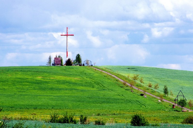 Практически из любого уголка дендрария открывается вид на близлежащий холм, на вершине которого стоит высоченный, 23-метровый, крест (говорят, в хорошую погоду его можно увидеть за 15 километров). Он был установлен в 2005-м, и с тех пор ежегодно вдоль дороги на мосарскую Голгофу появляются все новые и новые кресты, привозимые из разных стран.