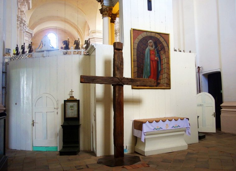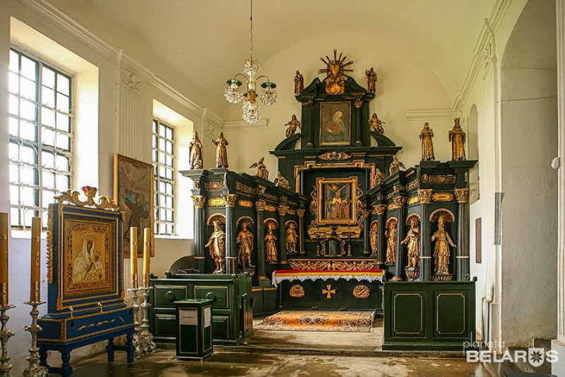 Да, а причем же здесь «храм-шкатулка», спросите вы? Все дело в том, что большой костел, построенный в конце XVIII века, как бы поглотил предыдущий храм, возведенный монахами-бернардинцами в первой половине XVII столетия. И попасть в древнюю святыню можно через алтарь более новой. В нем обратите внимание на деревянный крест, сложенный из бревен, которые 400 лет назад бернардинцы отправляли из местных лесов для строительства монастыря в Вильне. Два из них вернулось в Будслав спустя столетия.