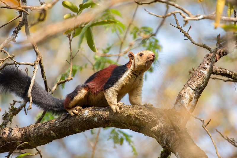 Эта белка и правда настоящий гигант по сравнению со своими обычными сородичами. Сравните сами: длина тела индийской белки может достигать 100 сантиметров (с хвостом), обыкновенной белки — около 40 сантиметров (и это тоже с хвостом!). Гигантские белки живут изолированными группами в вечнозеленых лесах Центральной Индии. У каждой группы свой окрас; мех может быть и кремовым, и темно-коричневым — в зависимости от места, в котором живет группа белок. В отличие от обыкновенных белок, гигантские белки редко спускаются на землю — здесь они могут стать добычей хищников.