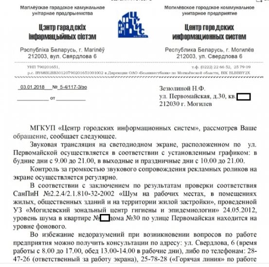 Большинство же ответов из ЦГИСа и горисполкома — о том, что радиус звукового охвата светодиодного экрана ограничен 100 метрами. То есть на противоположной стороне улицы и, соответственно, в квартирах жильцов дома № 30 его не должно быть слышно. В последнем ответе на жалобу директор ЦГИСа Елена Большекова ссылается также на результаты проверки центра гигиены и эпидемиологии: уровень шума в квартире Зезюлиной находится на уровне фонового.