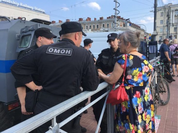Полицейские попытались задержать женщину с плакатом: «Упырь, верни пенсию». Но другие участники акции окружили правоохранителей и с криками отбили женщину.
