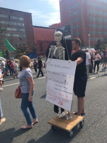 В целом же митинг пришел под общие слова о том, как плохо работает нынешняя власть и насколько хорошо жилось в СССР. О самой пенсионной реформе по существу говорили мало. Вся критика была написана на плакатах собравшихся: «Путин — враг народа», «Власти нужны тупые работяги», «Пенсия в гробу не нужна никому», «Чем меньше вас останется, тем больше нам достанется».
