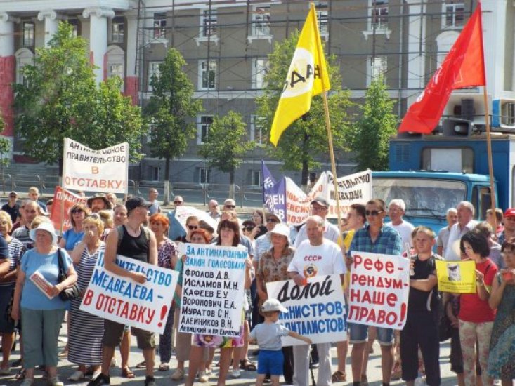 Все выступавшие отмечали необходимость сплотиться, невзирая на политические разногласия, и объединиться против власти, которая «рассматривает своих граждан как рабов». Под лозунги «Путин и Медведев — позор России», «Голодный пенсионер — позор власти», «Поднять пенсионный возраст тем, кто голосовал за Путина», «МедвеПутов — в отставку», «Долой президента и правительство!» КПРФ собирала подписи за референдум против повышения пенсионного возраста, а Общественный городской совет — за «запрет партии „Единая Россия“, деятельность которой противоречит Конституции РФ».