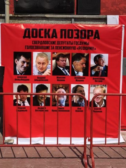 На митинге в Екатеринбурге появилась доска позора с депутатами, которые хотят лишить людей нормальной старости.