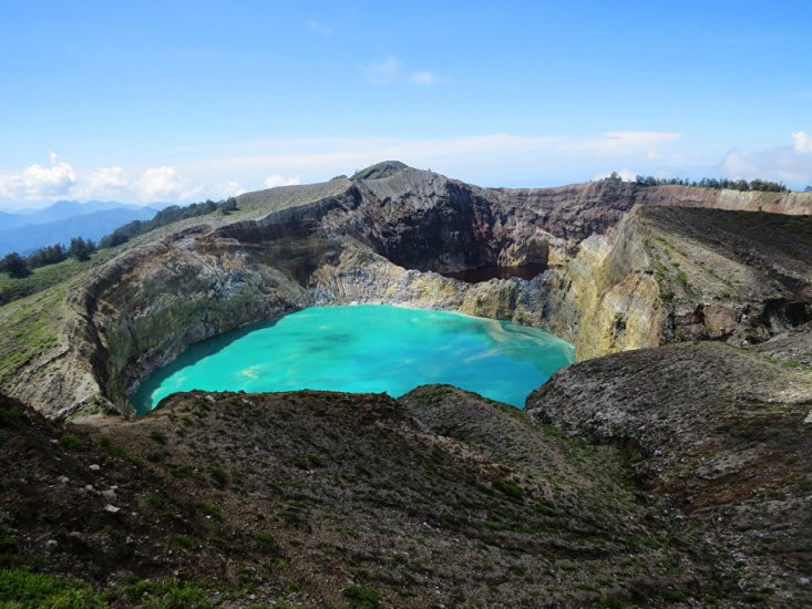 Необычные водоемы, расположенные на вершине вулкана, имеют свойство периодически менять цвет от бирюзового до зеленого, красного, коричневого или черного. Ученые утверждают, что это связано с химическими реакциями между минералами и газом.