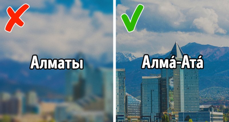 Алма-Ата — это тот случай, когда географическое название на языке происхождения разнится с написанием и произношением на русском языке. На казахском город называется Алматы, а вот нормативное название на русском — Алма-Ата.