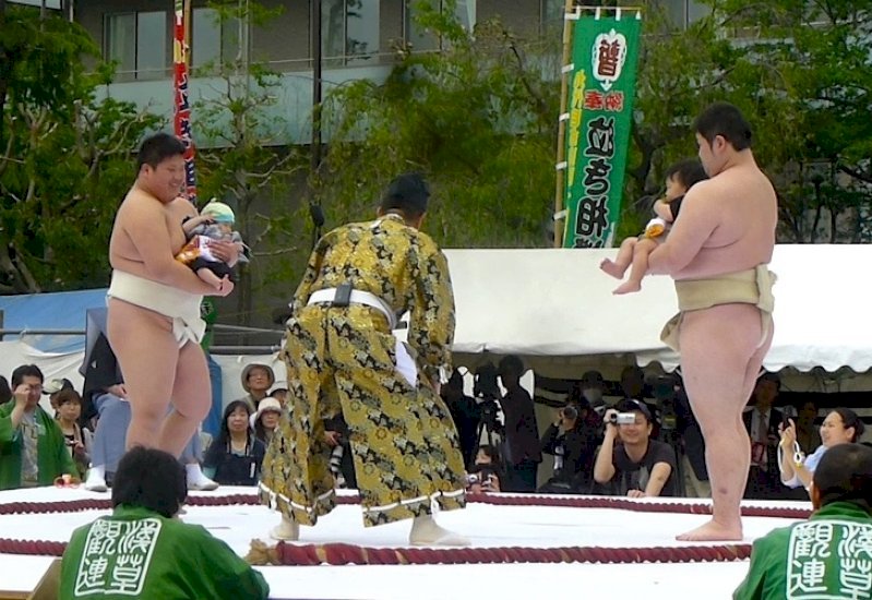 Традиционный японский фестиваль «Наки сумо» («Борьба плачущих младенцев») проводится уже 400 лет. Каждую весну в городских храмах дети в возрасте до года «соревнуются» в громкости плача. Во время состязания два борца сумо становятся лицом друг к другу, держа малышей на руках, и по команде судьи начинают издавать устрашающие звуки и строить гримасы в попытках заставить детей заплакать. Если ребенок не реагирует, к запугиванию подключается судья в маске дьявола. Считается, что младенческий крик отпугивает злых духов и чем он громче, тем большую силу дали ребенку боги, тем здоровее он будет.