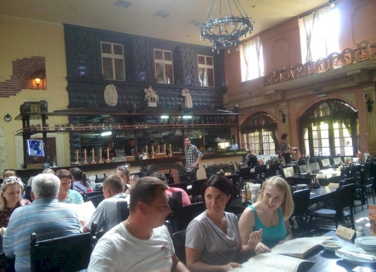 После обеда – гастрономическая экскурсия по городу. Побывали на чешской пивоварне, где нам показали производство и угостили разными видами пенного напитка, посетили несколько ресторанчиков, в которых попробовали львовские настойки и фирменные закуски. А еще мы встретились с паном Малодобрым – палачом из Средневековья, главным часовщиком и трубачом Львова. Побывали в еврейском квартале, где импровизированный дракон дышит огнем.