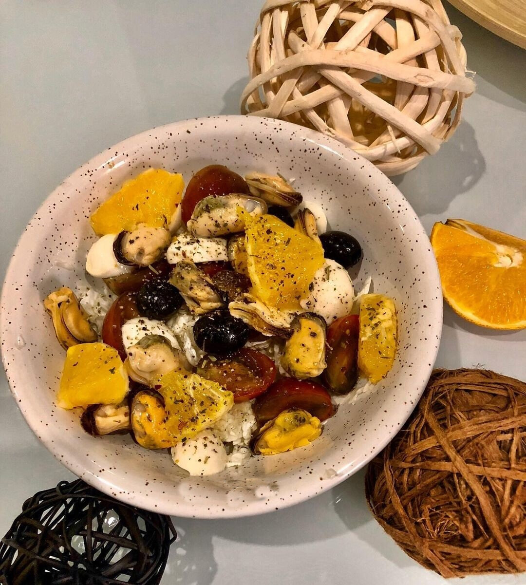 Смешать ингредиенты, приправить специями и оливковым маслом.