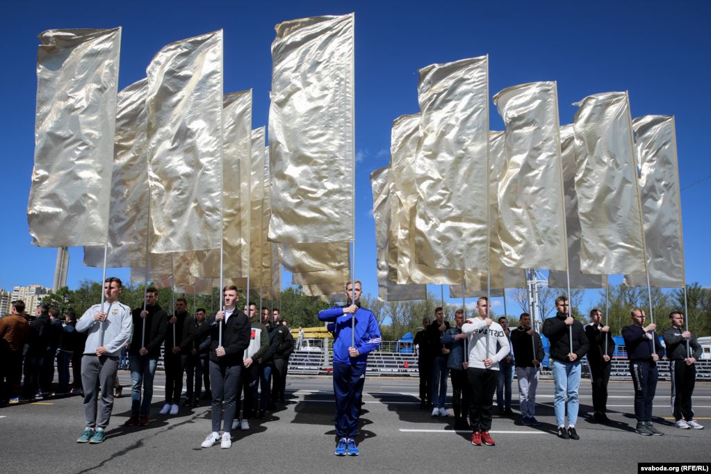 Сегодня в Минске проходит очередная репетиция парада 9 мая. Несколько сотен людей носили флаги и пели военные песни. Большинство участников были без масок и перчаток, передает «Радыё Свабода».