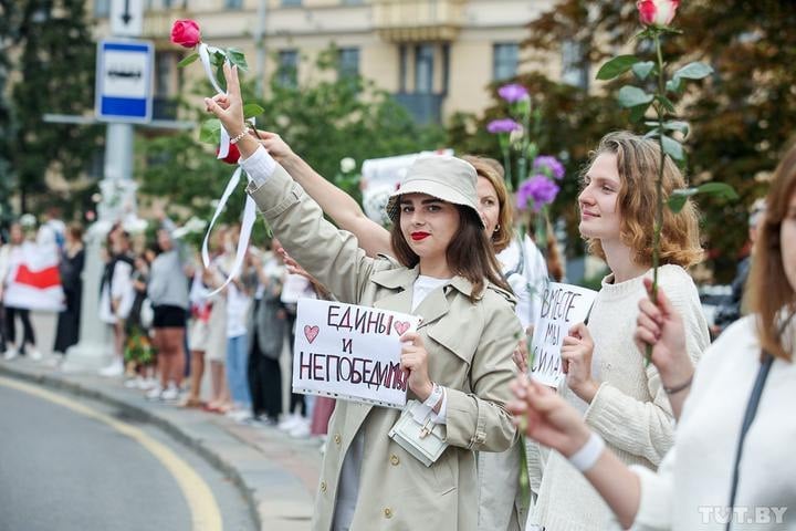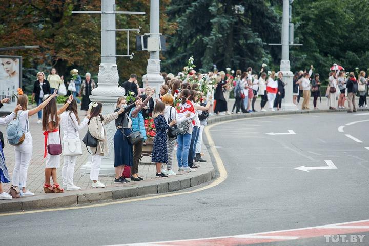 Как пишет Telegram-канал NEXTA, площади Победы в Минске выстроилась цепь солидарности. Люди встали возле проезжей части с цветами, автомобилcты сигналят в знак поддержки.