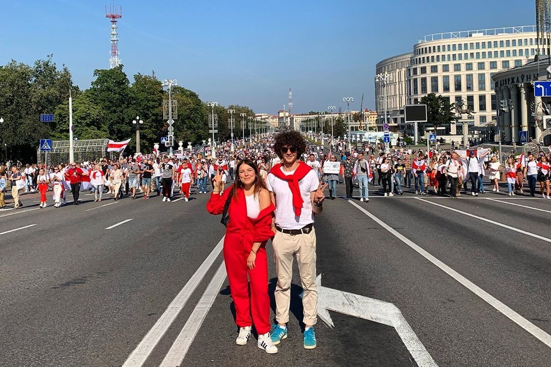 На нескольких митингах солидарности под бело-красно-белым флагом побывали ведущие Денис Дудинский и Катерина Раецкая. Например, они приняли участие в Марше свободы у стелы 16 августа.