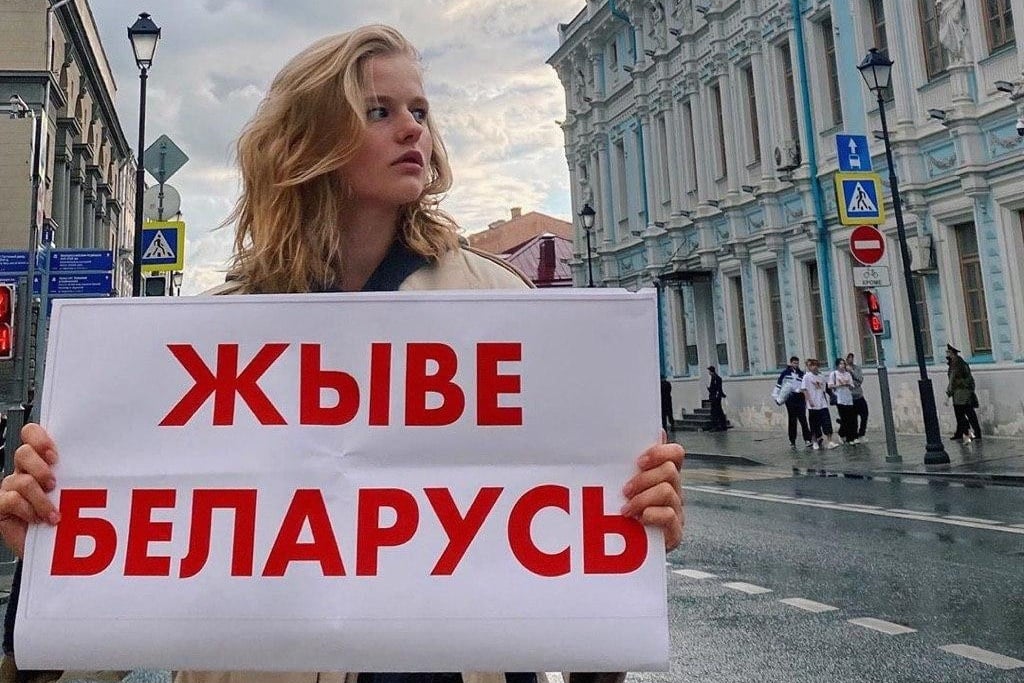 Актриса Александра Бортич также не осталась в стороне. Она поддержала соотечественников тем, что вышла с пикетом к посольству нашей страны в Москве. В ее руках — плакат с надписью «Жыве Беларусь».