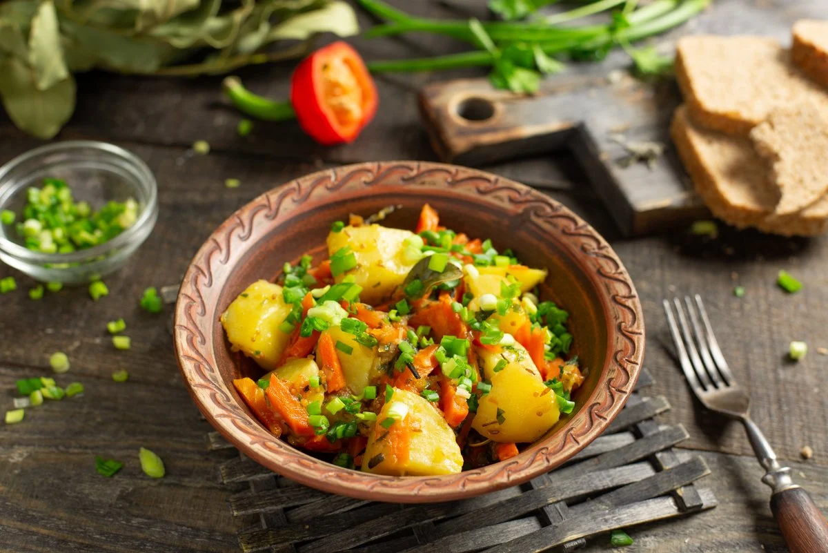Шестое блюдо — гарнир. Отличный вариант — тушеный картофель с луком и морковкой.