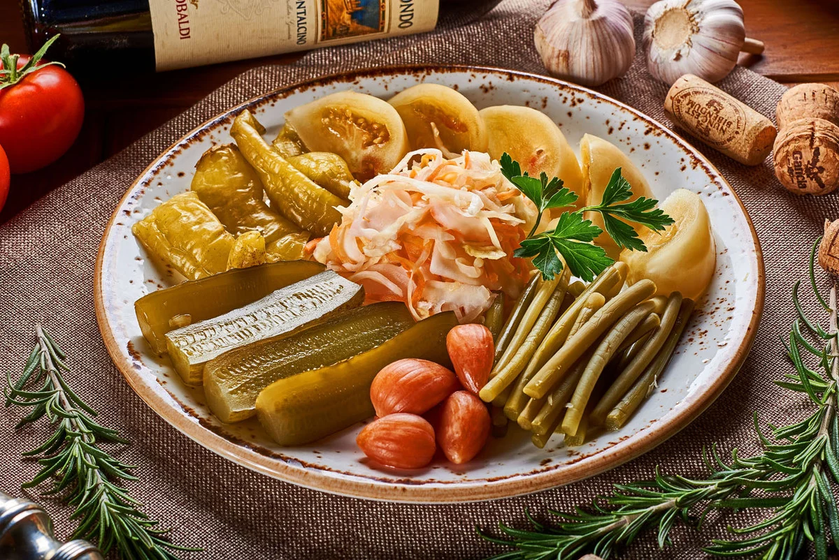 Седьмое блюдо — соленья. Грибы, огурцы, квашенные помидоры и капуста.