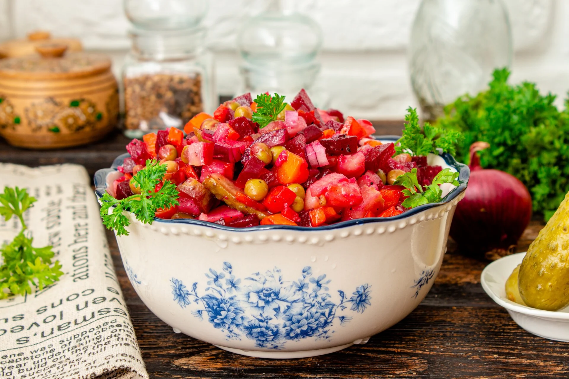 Восьмое блюдо — постные салаты. Идеальный вариант — это винегрет. Блюдо несложное, но оно украсит любой праздничный стол.