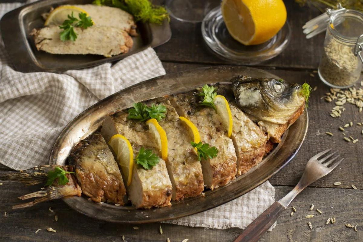 Десятое блюдо — рыба. Украшением стола может стать фаршированная рыба. Несмотря на пост, есть ее в сочельник можно. Ведь это символ христова чуда из притчи о том, как Иисус накормил толпу рыбой и хлебом.