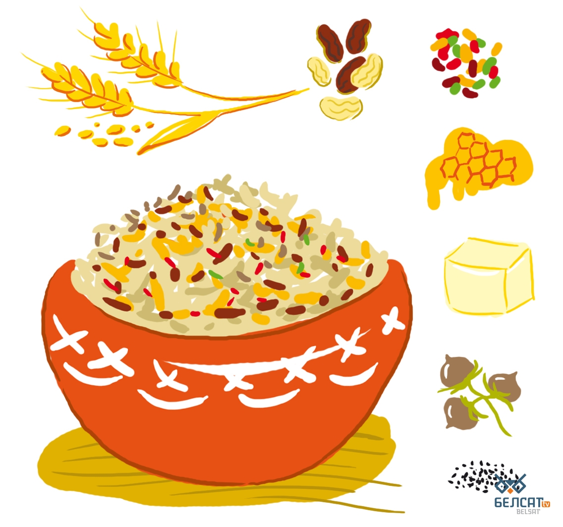 Составляющие: пшеница – 1 стакан, черные и белые изюм – 100 граммов, цукаты – 200 граммов, мед – 2 ложечки, масло – 50 граммов, орехи и мак – на вкус.