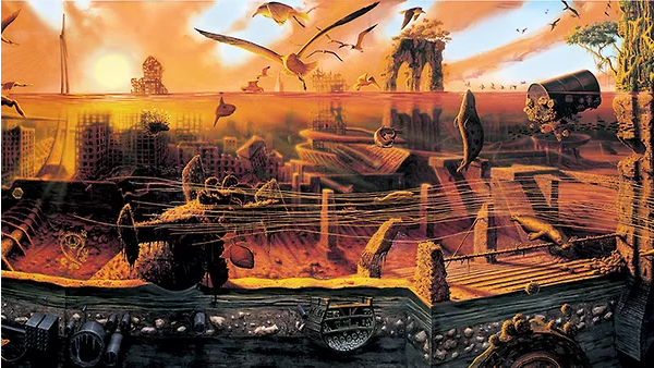 5004 год, Бруклин — от знаменитого моста до Бруклинского музея — затоплен водой, городской ландшафт превратился в ландшафт дна Мирового океана, который заселили тропические животные и растения, эмигрировавшие сюда из-за глобального потепления. Фантасмагорический пейзаж не просто художественная фантазия — в том, как будет выглядеть мир, если человечеству не удастся остановить глобальное потепление, американского художника Алексиса Рокмана консультировали лучшие ученые и эксперты.