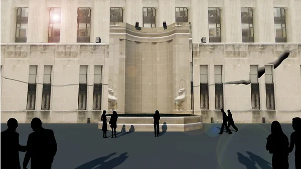 Из множества динамиков расставленных вокруг одного из самых узнаваемых зданий города — Riverside Plaza — доносились звуки распада айсберга, а на самом здании появилось граффити в виде трещины. Точно такая же, только в 9 тыс. раз больше, весной 2017 года образовалась в арктическом леднике Ларсена, а летом от него откололся очередной гигантский айсберг весом в 1 трлн тонн.