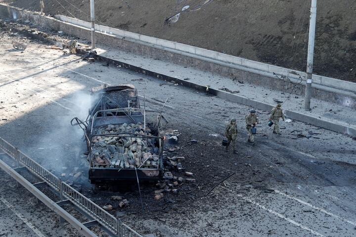 Украинские военные проходят мимо поврежденной машиной на месте боев с русской диверсионной группой в Киеве, Украина, 26 февраля