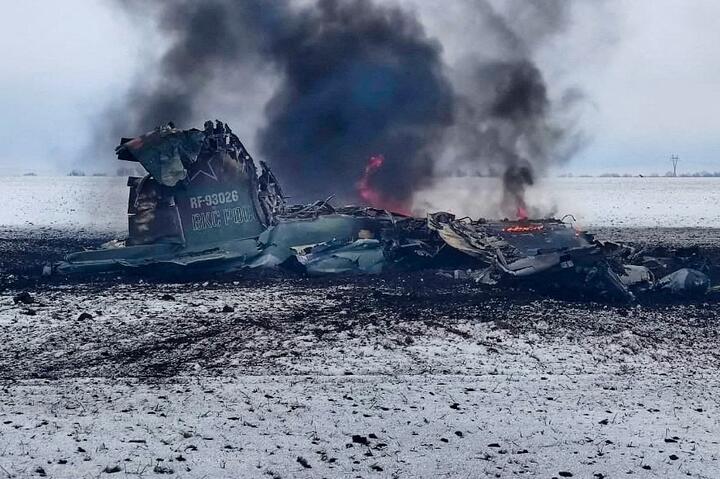 Обломки штурмовика ВВС России горят в поле недалеко от города Волноваха в Донецкой области, 4 марта 2022 года