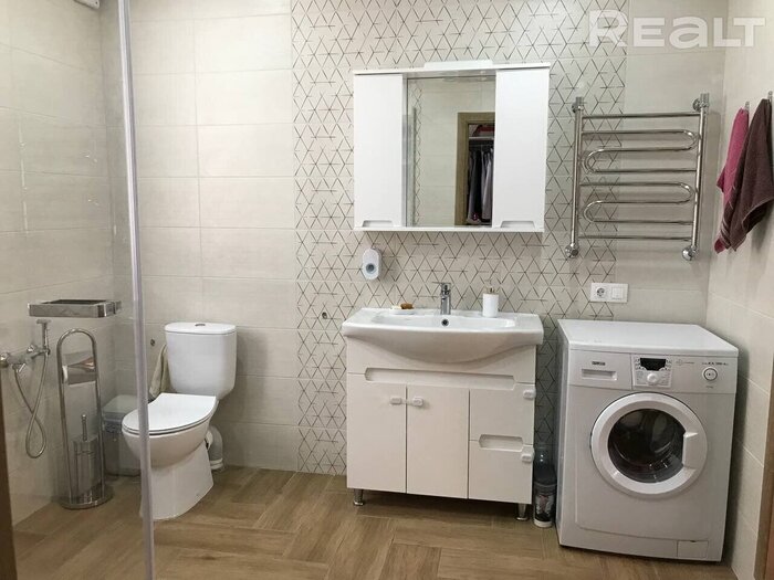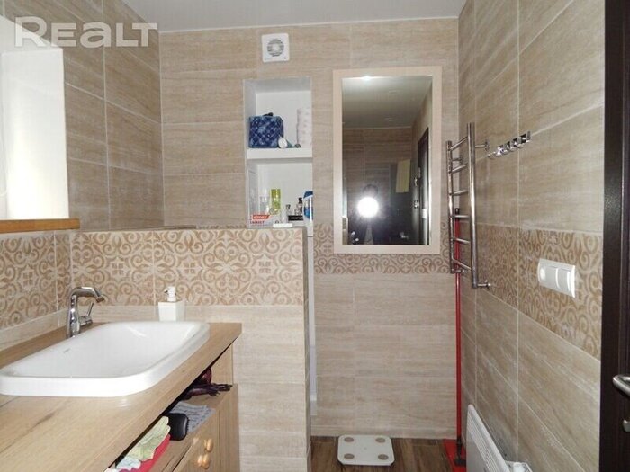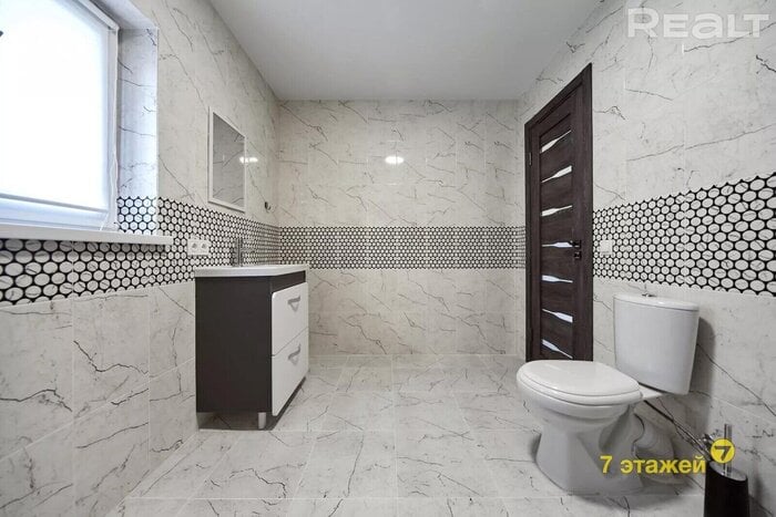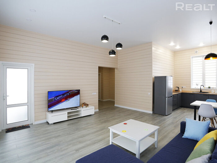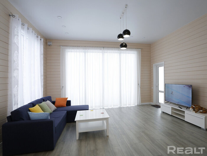 Внутри он полностью готов к проживанию. На полах с подогревом в кухне-гостиной, санузлах, топочной и коридоре лежит плитка. В жилых комнатах — ламинат. Потолки натяжные.
