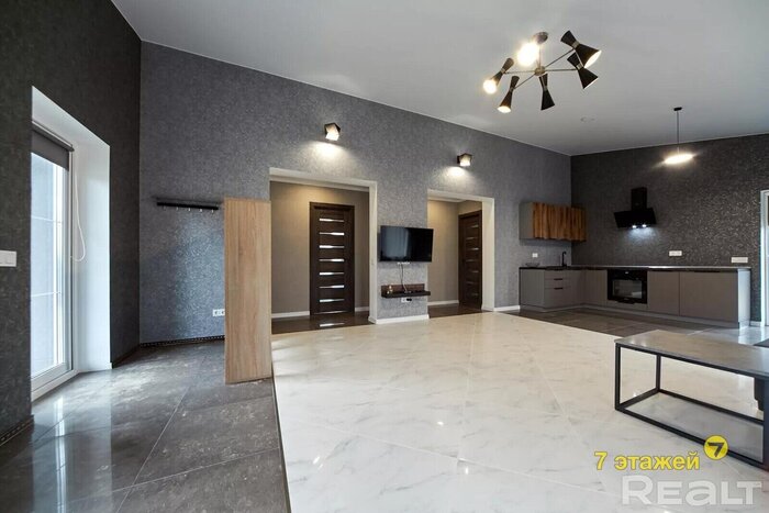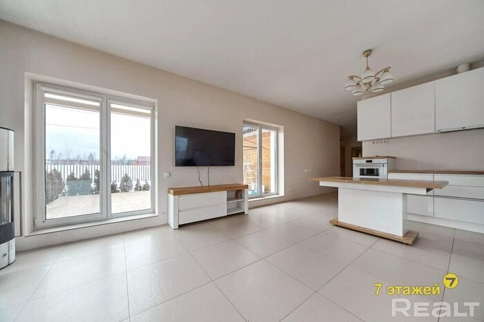 Внутри хороший ремонт с применением современных материалов. Планировка такая: зал совмещенный с кухней, три спальни, два санузла, гардеробная. Из комнат есть выход на внутреннюю террасу.