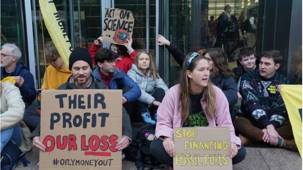 Тунберг вместе с активистами из группы Fossil Free London заблокировала вход в лондонский офис JP Morgan, требуя от банка прекратить финансирование проектов, связанных с ископаемым топливом.
