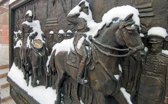 На горельефе изображены маршалы Советского союза Георгий Жуков и Константин Рокоссовский. Последний командовал Парадом Победы 1945 года и был на коне по кличке Полюс.