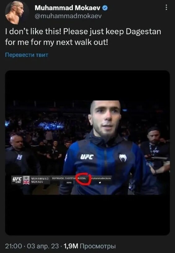 22-летний боец возмутился Мухаммад Мокаев упоминанием России в видеоплашке с его представлением. Он обратился с просьбой не упоминать о его происхождении из России.