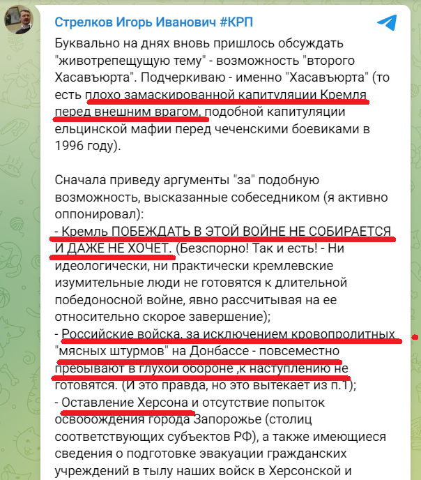 По словам Гиркина, происходящее в последние месяцы все более убеждает его в том, что Россия не сможет выиграть войну. Оккупанты прекратили наступательные операции практически на всех участках фронта, переходя в глухую оборону.
