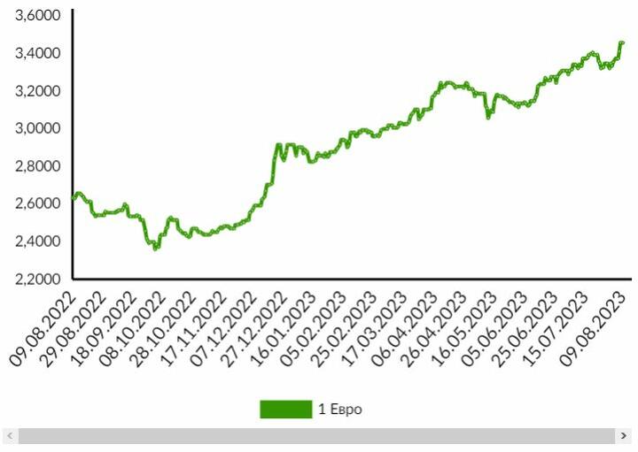 Курс евро по Нацбанку на 9 августа 2022-го был 2,6803 рубля, а сейчас — 3,4267 рубля. Рост — на 27,9%.