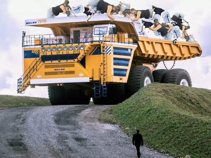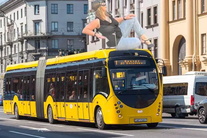 Вот она на фуре, на тракторе, на крыше автобуса на главном проспекте Минска, на крыше локомотива на вокзале, в кузове БЕЛАЗА, в багажнике, на мотоцикле и даже в космосе.