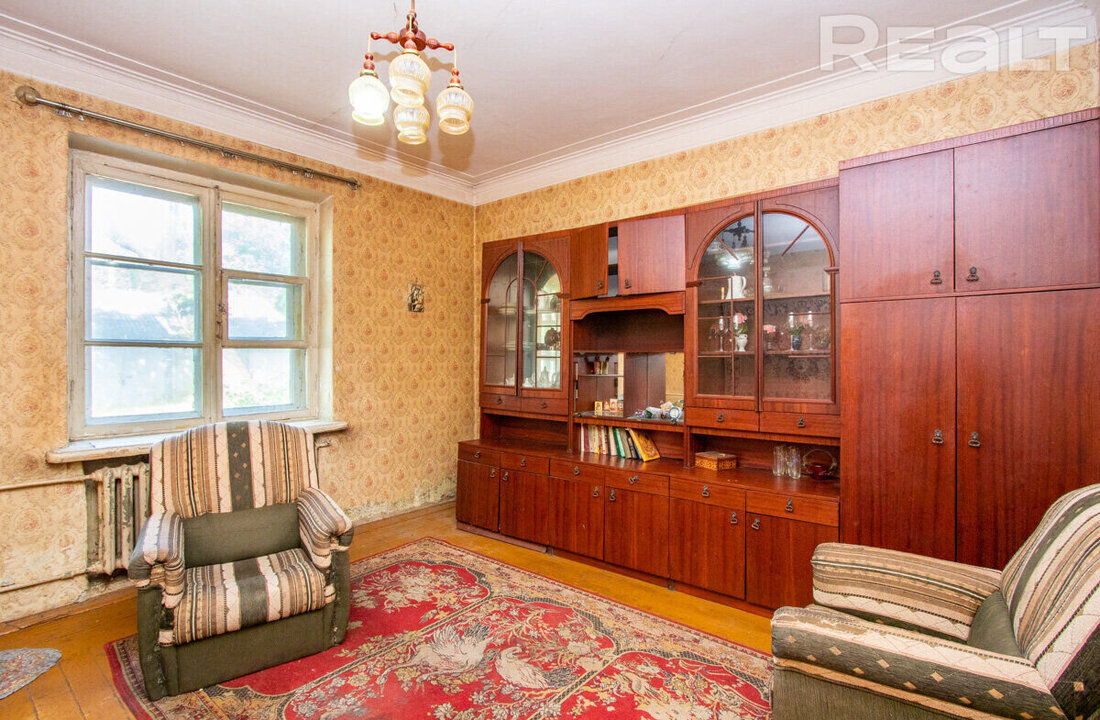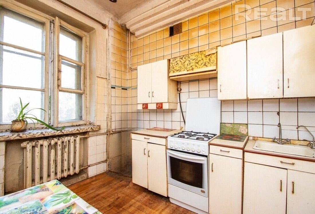 Сталинка на Янки Мавра, 70 была построена в два этажа в 1955 году. На первом этаже там находится квартира в 58,9 м² с кухней в 7,9 м².