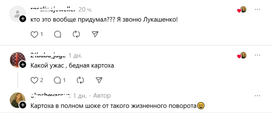 И хотя белорусы к картошке привычны, реакция на «законсервированную бульбу» оказалась неожиданно эмоциональной. Количество комментариев перевалило за три сотни.