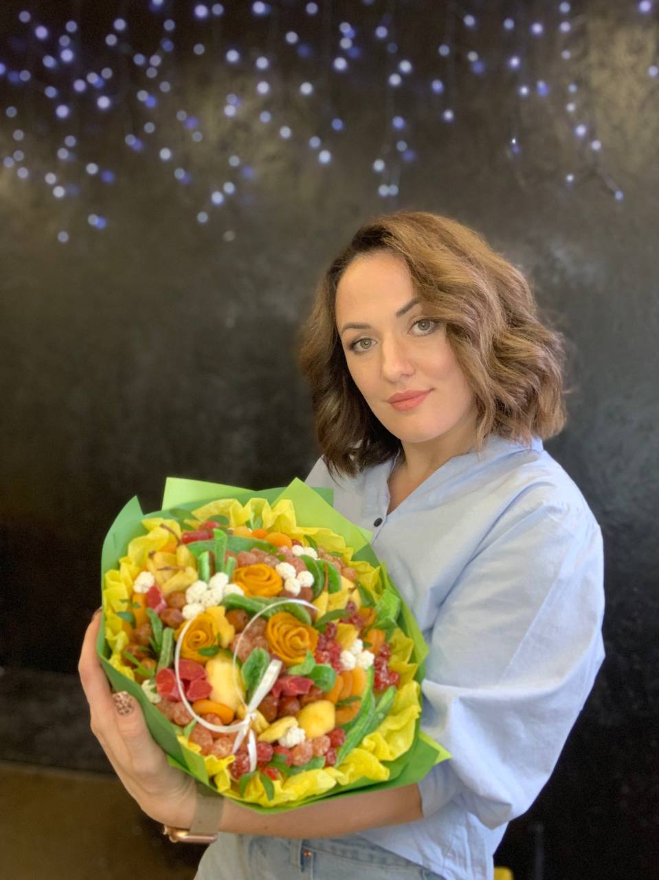 Посмотрела на youtube, как он делается — ничего сложного. Составила букет в основном из того, что было дома: фрукты, шпажки, упаковка, что-то докупила. А еще до этого мне самой дарили ореховый букет. Он полгода стоял в вазе для красоты, а потом я решила его развернуть и съесть, так что примерно понимала, как он формируется. К моему удивлению, букет произвел фурор — тогда, в 2017 г., это не было таким популярным, как сейчас.