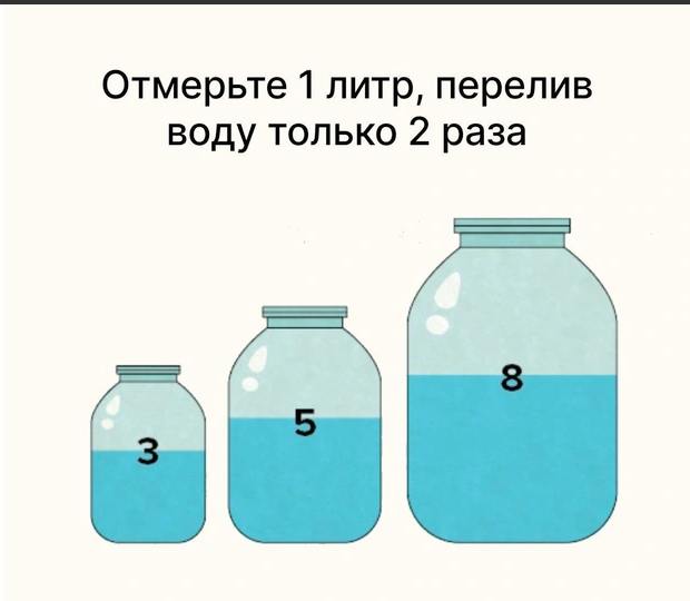 Задача простая: нужно отмерить ровно 1 литр воды с помощью этих бутылок, перелив воду всего 2 раза, доливать воду из крана — нельзя. В трехлитровой банке — 2 литра воды, в пятилитровой — 3 литра воды, в восьмилитровой — 5 литров воды.