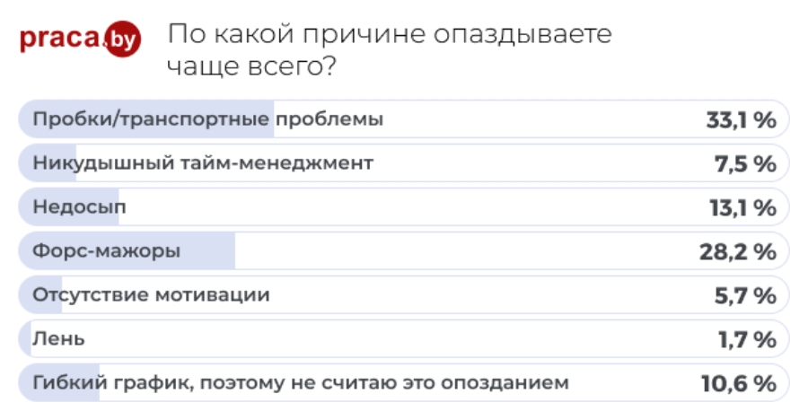 Кстати, чаще всего причиной опозданий сотрудники называют «пробки/транспортные проблемы» (33,1%) и «форс-мажоры» (28,2%).