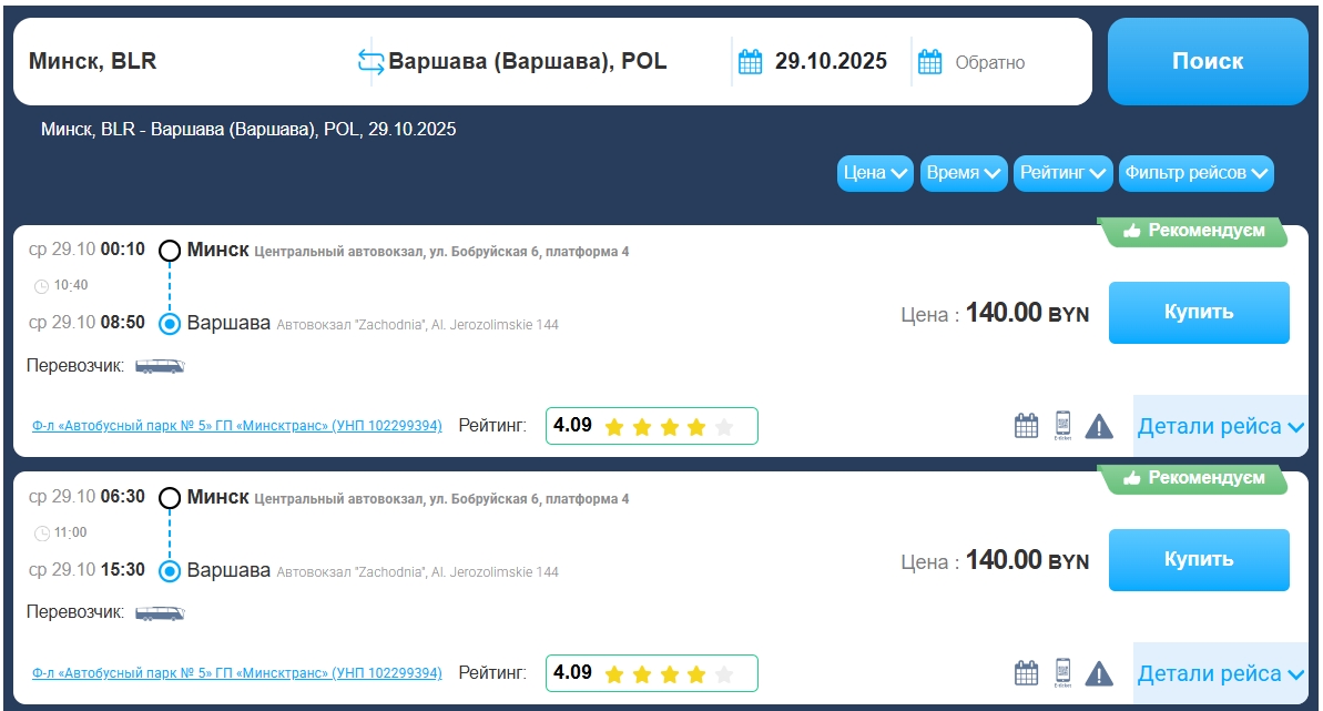 29 октября есть четыре автобуса между этими городами: первый отправляется в 1 час ночи, а самый последний — в 16.30 с прибытием в Польшу на следующий день. Так как едут автобусы через погранпереход возле Бреста, время в пути от 8 часов.