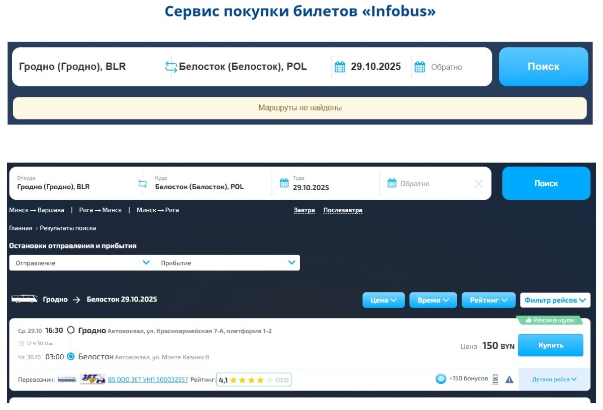 Примечательно, что Infobus через сайт «Минсктранса» не выдает никаких предложений по этому пути. Однако если открыть отдельно сайт этого сервиса, там рейсы находятся.