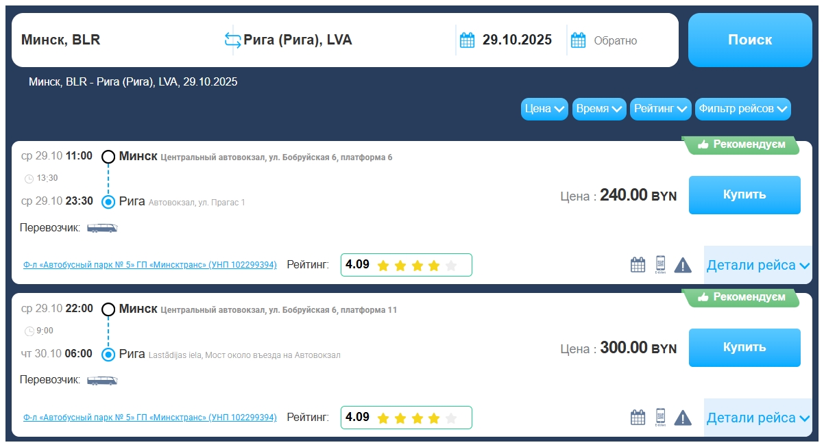 В день планируемого закрытия литовской границы на неопределенный срок — 29 октября — есть два рейса из Минска в Ригу. Их предлагает сервис Infobus, который интегрирован в сайт «Минсктранса». Один вариант — дневной с отправлением в 11 утра и прибытием в столицу Латвии в 23.30. Стоимость — 240 рублей. Второй — ночной и чуть более быстрый: он отправляется из Минска в 22.00 и прибывает в Ригу утром 30 октября. Билет на этот автобус обойдется в 300 рублей.