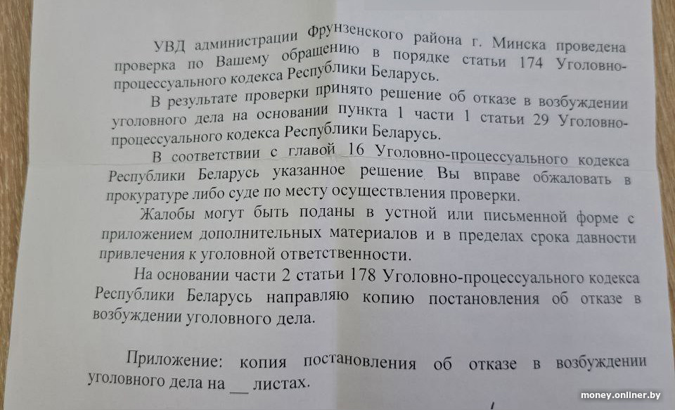 В возбуждении уголовного дела по статье о мошенничестве (часть 1 статьи 209 УК Беларуси) отказали, так как в действиях получателя денег не нашли признаков преступления.